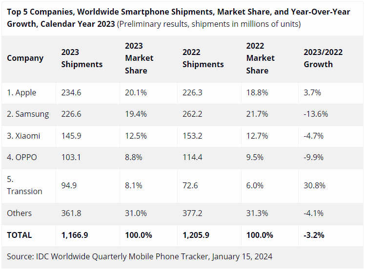 Если говорить об итогах всего 2023 года, то Apple увеличила объемы поставок смартфонов на 3,7 % до 234,6 млн штук и заняла 20,1 % мирового рынка. Samsung же не сильно отстала с 19,4 % рынка, однако объемы сократила на 13,6 % в годовом сравнении. Transsion, о которой мы говорили ранее, по итогам года заняла пятое место на мировом рынке смартфонов, при этом показала самые высокие темпы роста за год на уровне 30,8 %, а доля холдинга в 8,1 % не так уж далека от занимаемых OPPO позиций, это 8,8 %.