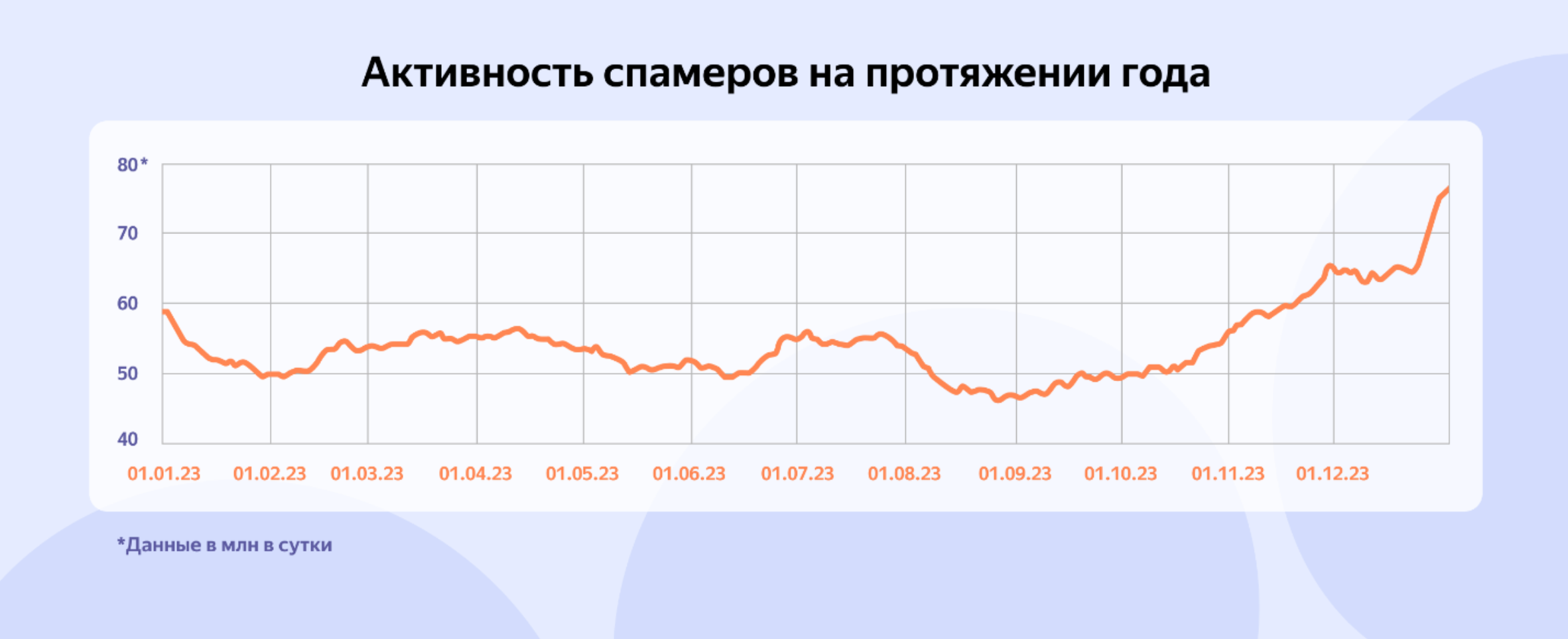 Аналитики Яндекс 360 изучили деятельность почтовых спамеров и выделили несколько периодов их повышенной активности. Ближайший всплеск продуктивности мошенников, чьи электронные вредоносные письма или спам блокируют наши почтовые сервера, начнется в середине февраля. В целом, активнее всего спамеры становятся ближе к весенним праздникам, в период осенних распродаж и к Новому году. А вот в начале года и конце лета – небольшое затишье. Относительно тихими с точки зрения активности спамеров можно назвать январь и первую половину февраля и начало бизнес-сезона (конец августа и сентябрь).