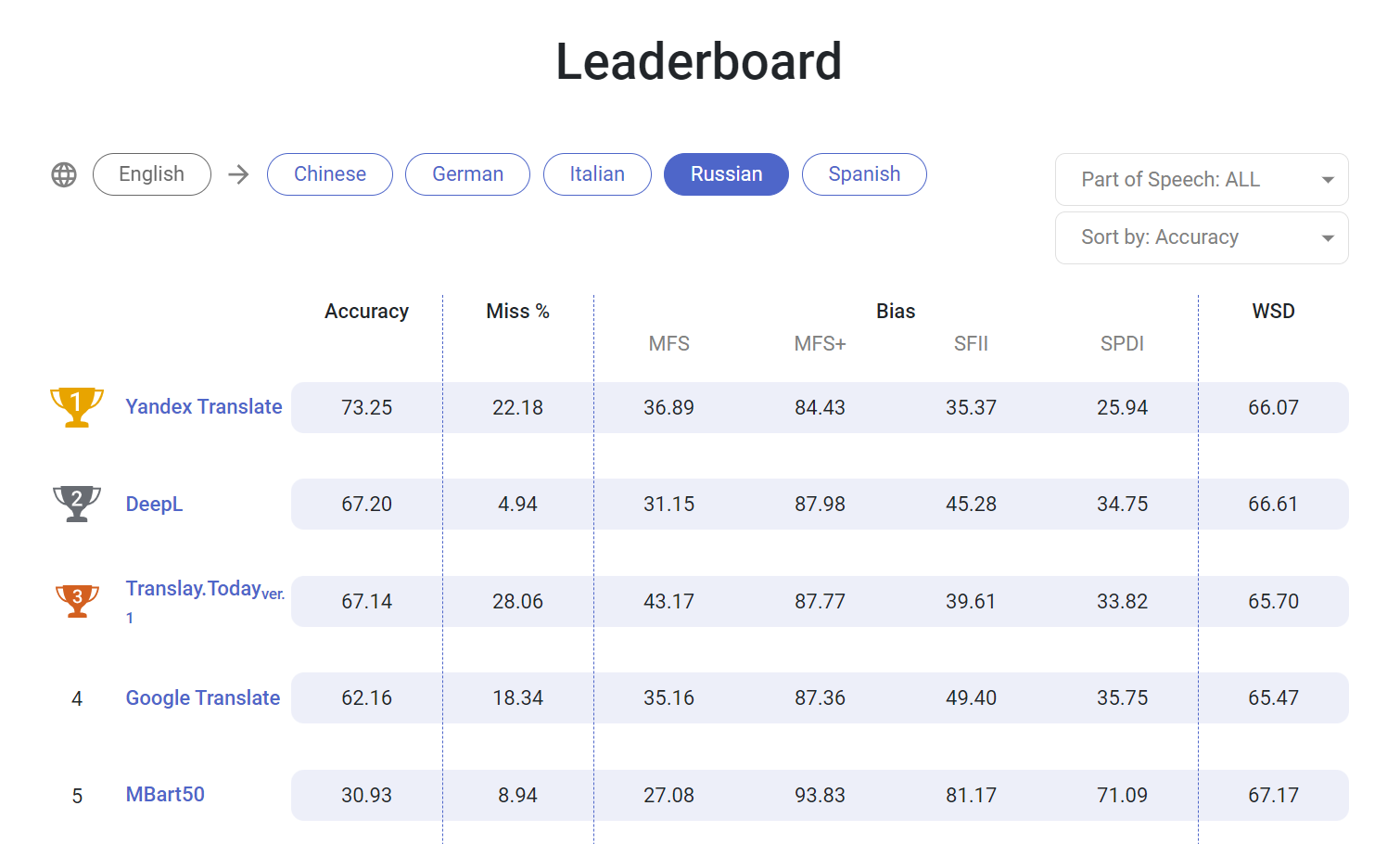 Исследователи собрали базу данных из нескольких тысяч предложений на английском языке с омонимами — одинаковыми по написанию словами, имеющими разное значение. Модели и сервисы перевели эти предложения, а алгоритмы бенчмарка определили процент корректно переведённых слов. Кроме того, правильные варианты выборочно проверяли профессиональные переводчики, что обеспечило высокое качество замеров. На основе этих показателей и был сформирован публичный рейтинг.