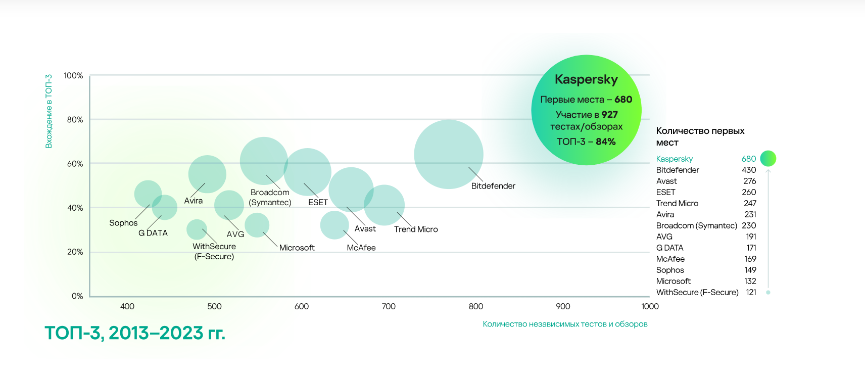 Показатель ТОП-3 отражает, насколько успешно в течение календарного года решения компаний-разработчиков защитных решений проходили независимые тесты. Такой подход объективнее и нагляднее, так как оценка рассчитывается исходя из результатов участия компаний сразу в нескольких независимых тестах, которые проводят лаборатории AV-Comparatives, AV-TEST, SE Labs и другие.