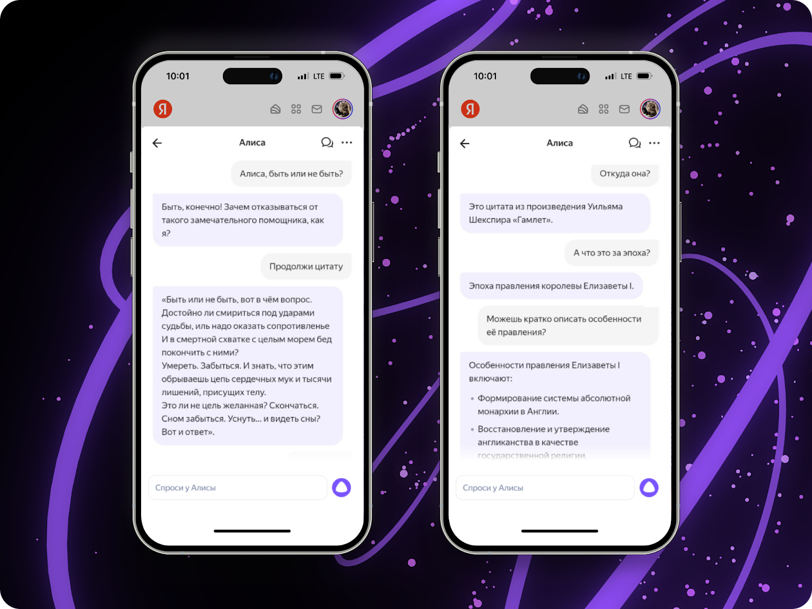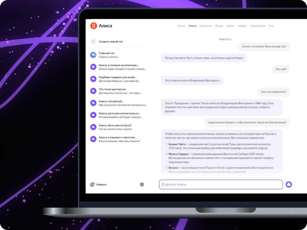 Алиса — виртуальный ассистент №1 в России, каждый месяц ею пользуются 66 миллионов человек. Алиса работает на основе мощной нейронной сети YandexGPT, что позволяет общаться с ней, как с человеком. Виртуальный ассистент доступен в Яндекс Станциях, ТВ Станциях, в сервисах и приложениях компании, на главной странице Яндекса (ya.ru) и в чате для работы с текстами на a.ya.ru.
