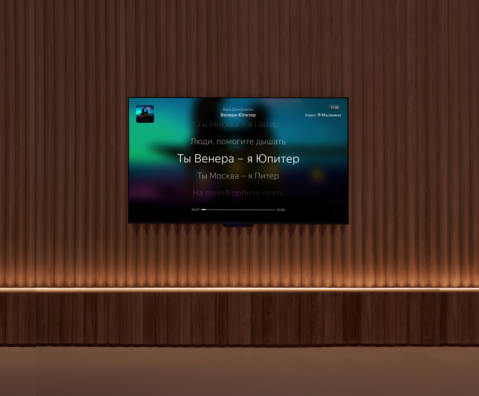 Если хочется подпеть любимому исполнителю, не стесняйтесь! Когда играет трек, просто скажите: Алиса, покажи текст песни, — и она выведет слова песни на экране вашей ТВ Станции. И можно сразу начинать караоке-вечеринку: Яндекс Музыка автоматически синхронизирует текст с текущей песней.