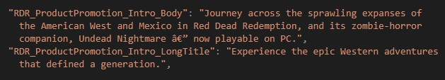“Отправляйтесь в путешествие по бескрайним просторам американского запада и Мексики в Red Dead Redemption и дополнении Undead Nightmare в жанре зомби-хоррора. Теперь они доступны для игры на ПК”, – гласит информация в коде.