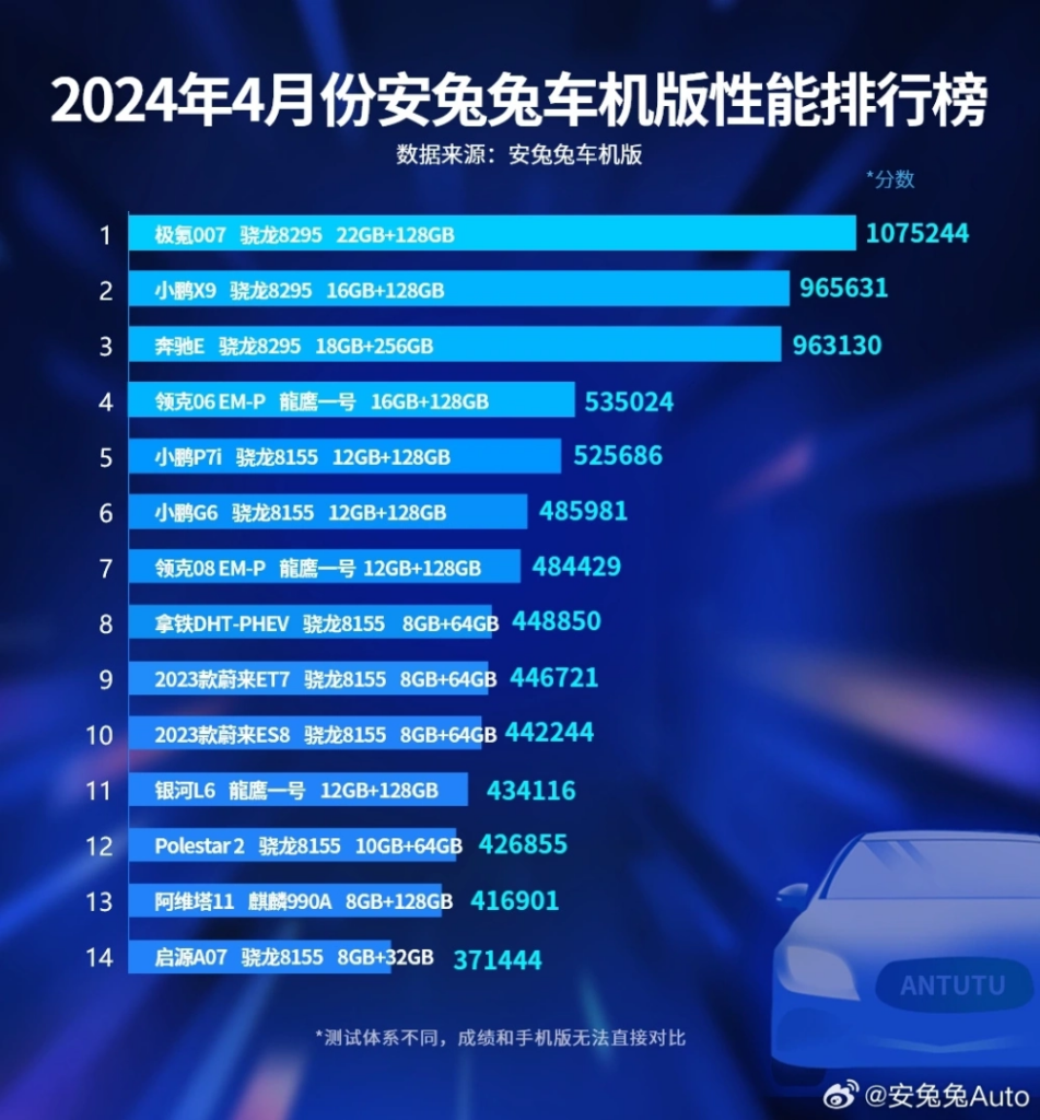 Также команда AnTuTu опубликовала апрельский рейтинг производительности бортовых компьютеров автомобилей. Первое место забрал Zeerk 007, которому удалось набрать более миллиона баллов, после него идет Xpeng X9, а на третьем месте – Mercedes-Benz E.