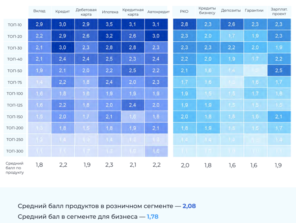 В каждом банке и по каждому продукту компания проставляла балл от 1 балла за описание продукта без всяких форм до 4 баллов — за личный кабинет. На схеме вы видите средний балл по сегментам, сформированным по величине активов банков.
