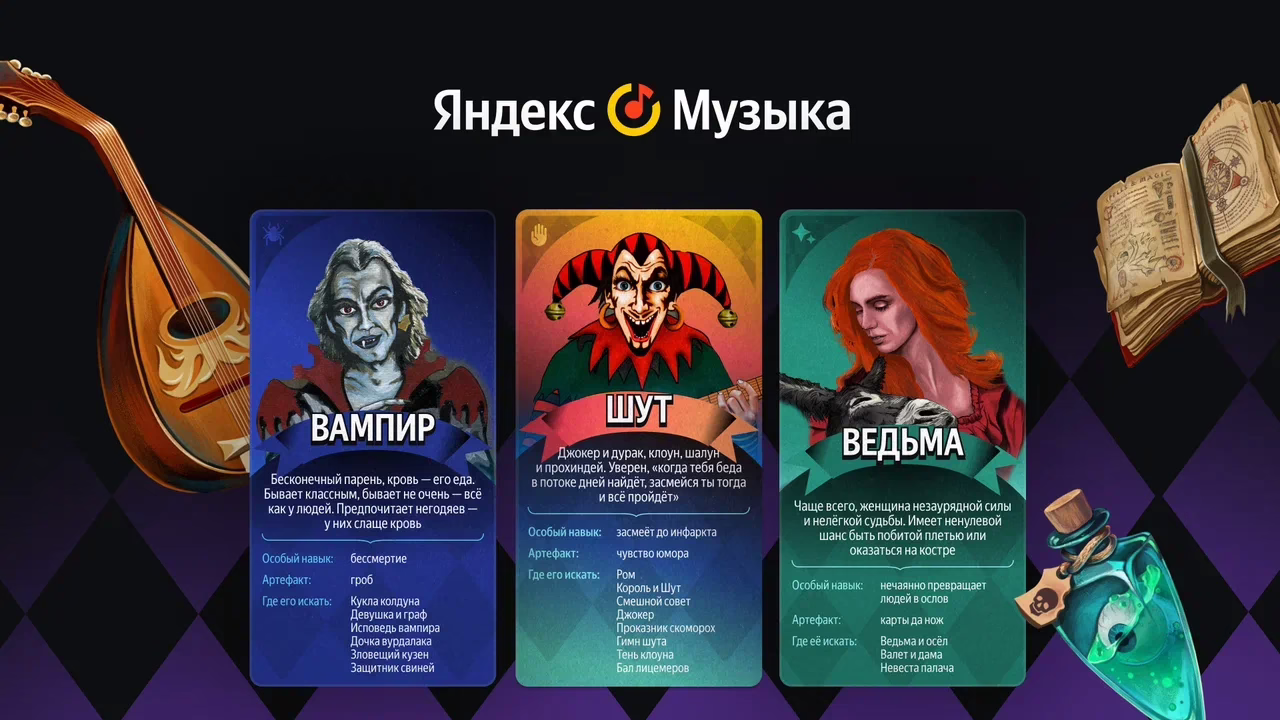 Для полного погружения в панк-культуру Яндекс Музыка изучила самые залайканные в Моей волне песни группы и создала музыкальные карты с персонажами — с Лесником, Ведьмой, Конюхом и другими. Уникальные иллюстрации героев отрисованы одним из лидеров группы Андреем «Князем» Князевым. Карты максимально выдержаны в стилистике группы, ведь именно «Князь» создал большую часть обложек для музыкальных альбомов «Король и Шут». У каждого персонажа из вселенной «Короля и Шута» особые характеристики, навыки и уникальный плейлист с треками. Карточки персонажей эксклюзивно представлены в приложении Яндекс Музыки и отсылают к подборке самых прослушиваемых треков на сервисе.