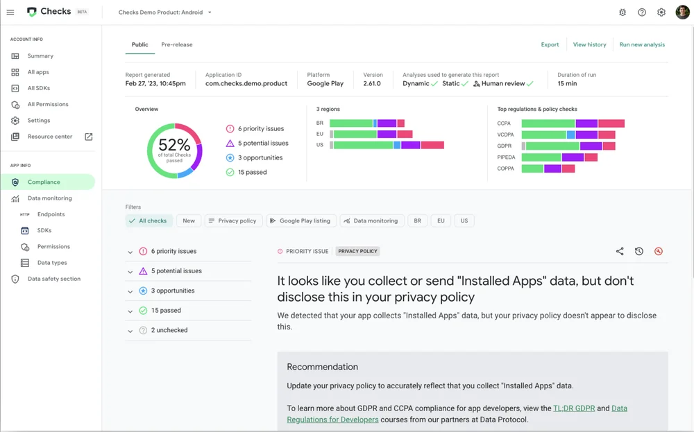 Checks — платформа на базе искусственного интеллекта, помогающая разработчикам мобильных приложений для Google Play и iOS быстро обнаруживать, сообщать и устранять проблемы с соблюдением конфиденциальности. Она работает на основе новейших больших языковых моделях (LLM) Google и технологий понимания приложений. Это позволяет ей обеспечивать автоматический анализ и сквозной мониторинг, чтобы затем выдавать соответствующие рекомендации, помогающие компаниям претворять идеи в жизнь — все это доступно через единую интуитивно понятную панель инструментов.
