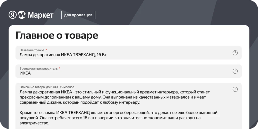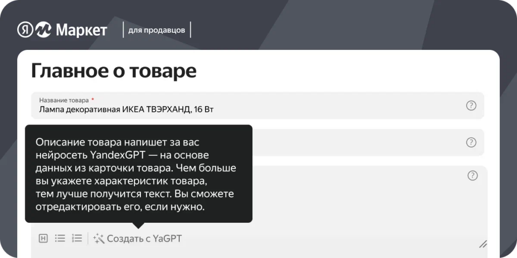 YandexGPT можно использовать для любых карточек, которые продавцы создали в личном кабинете на Маркете. Новая технология уже доступна всем магазинам на сервисе.