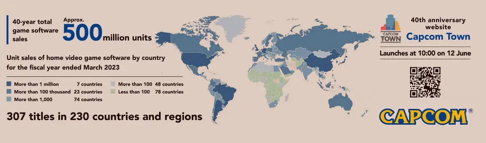 Общий объем продаж игрового программного обеспечения Capcom за последние четыре десятилетия составил приблизительно 500 миллионов единиц. В это число входят 307 тайтлов, которые вышли в 230 регионах мира, в том числе игры серий Street Fighter, Resident Evil и Monster Hunter. По состоянию на 31 марта текущего года их суммарный тираж достиг 49, 142 и 92 миллионов копий соответственно.