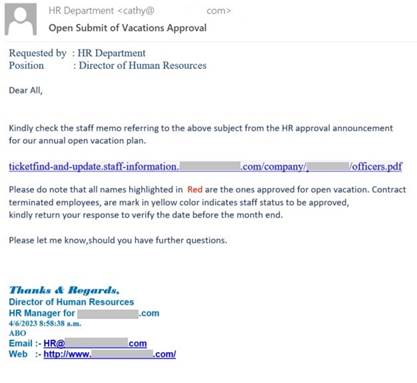 Эта массовая фишинговая рассылка, реализуемая в период отпусков, может привлечь внимание и усыпить бдительность адресатов, которые иногда действительно получают подобное сообщение от отдела кадров.