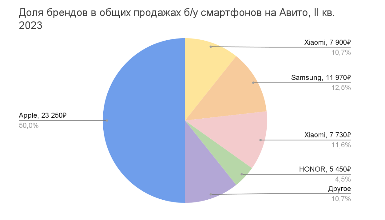 Первое место по количеству проданных на Авито смартфонов традиционно занял Apple — на него пришлось 57% от всех приобретенных новых устройств. По сравнению со II кварталом 2022 года продажи новых iPhone на платформе выросли на 81%. В среднем новое “яблочное” устройство можно приобрести за 47 660 рублей. Средний чек за б/у гаджет в апреле-июне этого года составил 23 250 рублей, а покупали их на 21% чаще, чем в прошлом году.