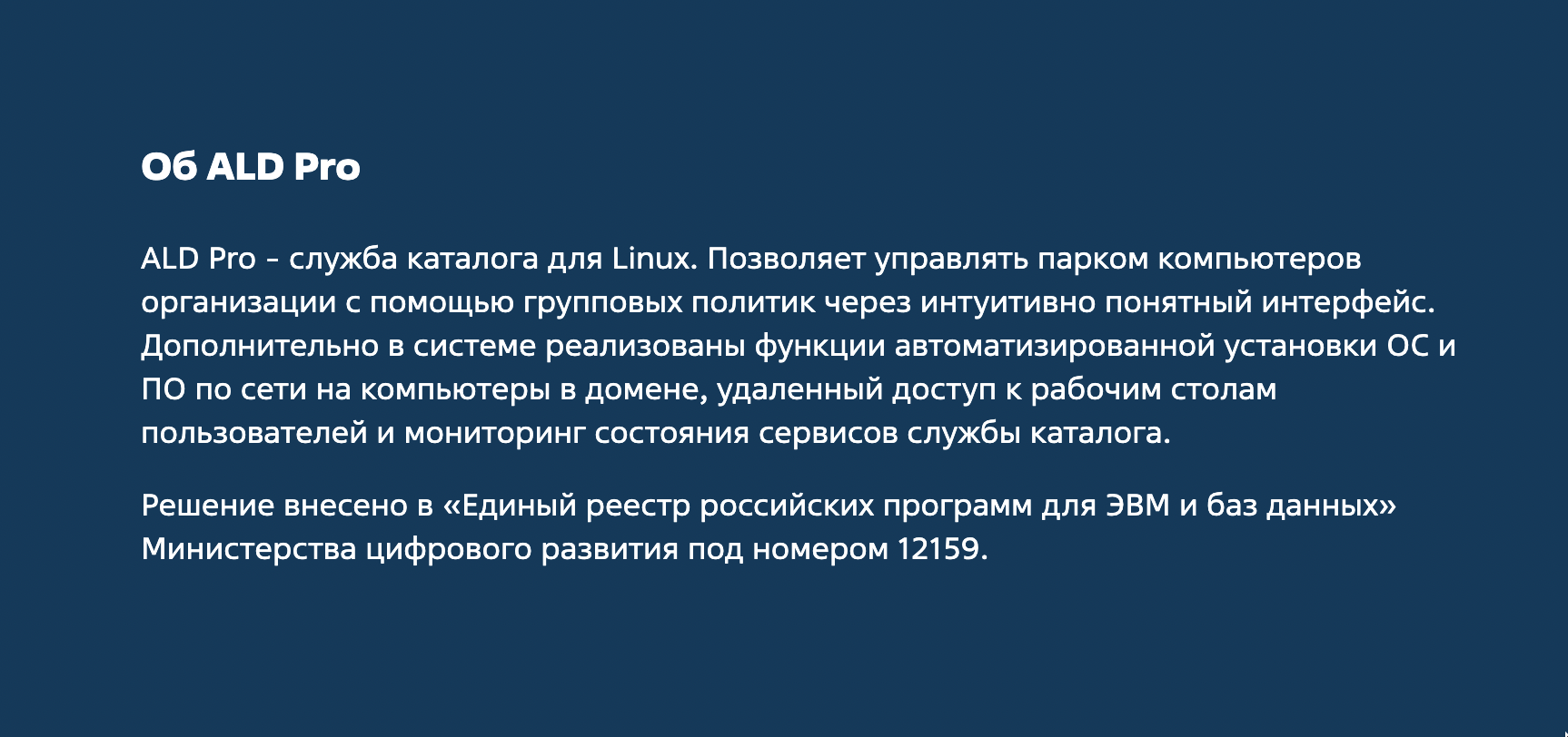 Российская компания “Астра”, ведущий разработчик инфраструктурного программного обеспечения, анонсирует выпуск новой версии службы каталогов – ALD Pro 2.0. Эта система позволяет создавать домен на базе Linux и управлять парком компьютеров организации с помощью групповых политик через простой и понятный интерфейс. В ALD Pro реализованы функции автоматической установки операционных систем и программного обеспечения на компьютеры в домене, удаленного доступа к рабочим столам пользователей и мониторинга состояния сервисов службы каталога. Продукт зарегистрирован в “Едином реестре российских программ для ЭВМ и баз данных” под номером 12159.