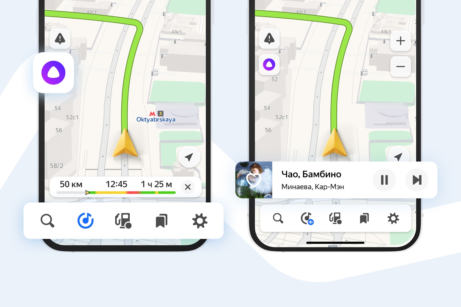 Чтобы музыка заиграла, нужно зайти в режим Навигатора, нажать на иконку с нотой и выбрать трек. Можно построить маршрут или просто кататься — во время поездки на карте будет оставаться мини-плеер, чтобы переключать треки или ставить на паузу.