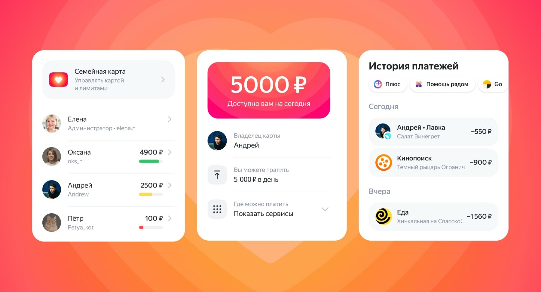 Владелец семейного аккаунта может устанавливать разные лимиты по карте – дневной, недельный или месячный для каждого участника семьи. С помощью пуш-уведомлений и личного кабинета Яндекс ID владелец аккаунта сможет контролировать лимит, настраивать его, отслеживать траты и проверять историю операций по семейной карте.