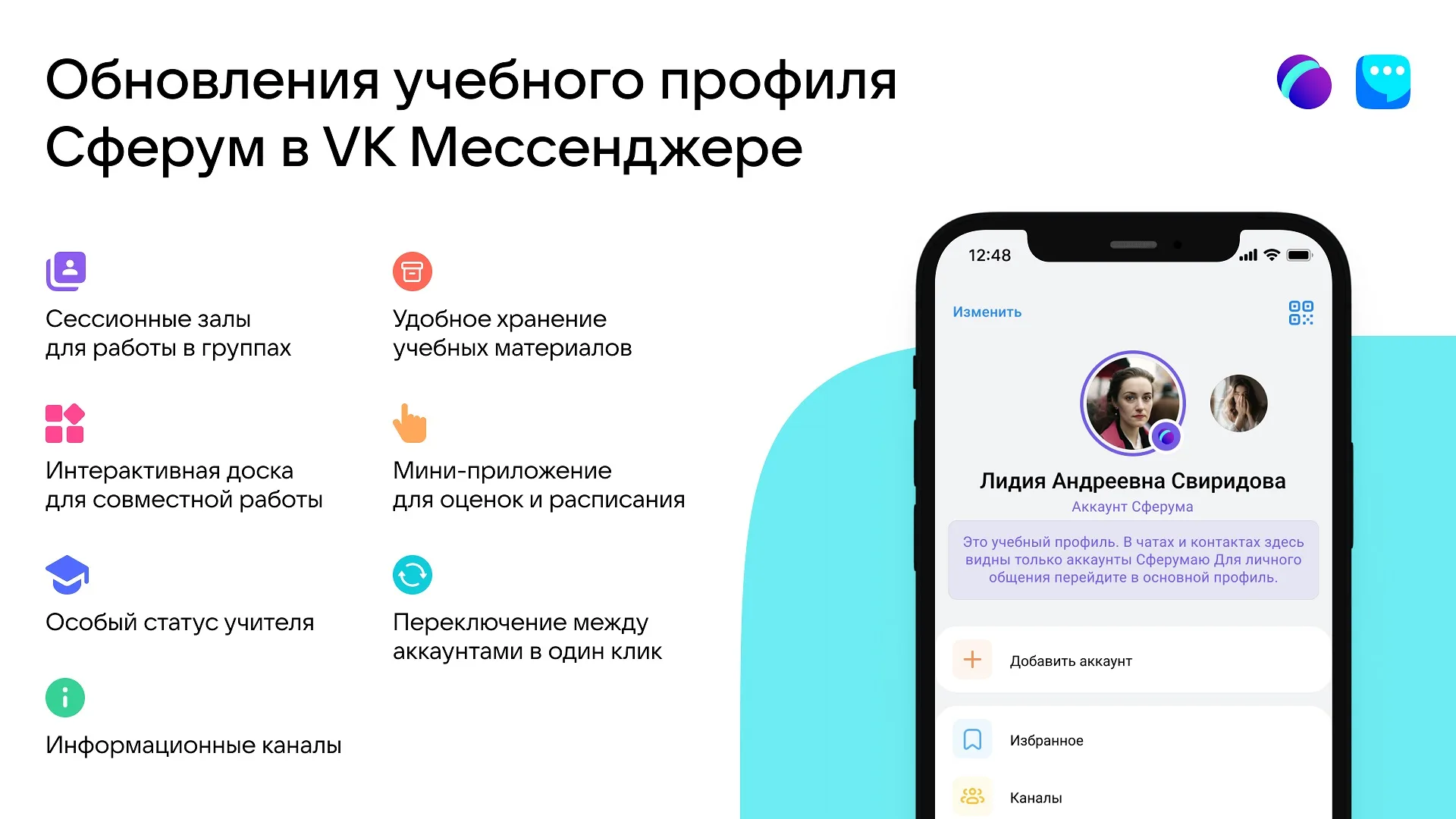 Упрощен процесс переключения между учебным и личным профилями в VK Мессенджере – теперь перейти из одного аккаунта в другой можно в один клик. Кроме того, в учебном профиле Сферум можно быстро начать общение с другим пользователем, пригласив его в чат при помощи QR-кода.