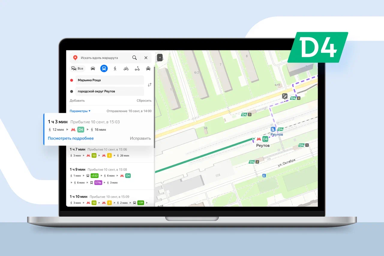 Теперь МЦД-4 учитывается при построении маршрутов, включая те, где сочетаются разные виды транспорта. Например, Карты покажут, как быстрее дойти пешком до станции МЦД и где лучше пересесть на метро, автобус или другие диаметры, чтобы быстрее добраться до нужного места.