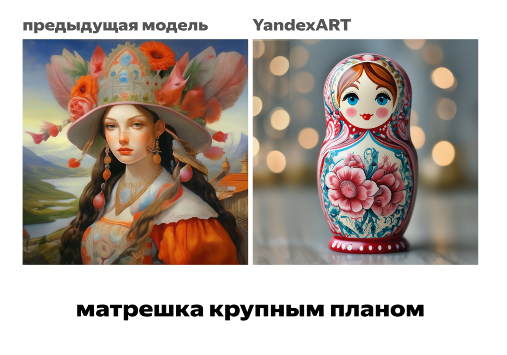 Для улучшения качества работы нейросети разработчики увеличили размер обучающего набора данных в 1,5 раза — до 330 миллионов картинок с текстовым описанием. Для обучения YandexART используются самые эстетичные изображения, которые отбираются с помощью трех режимов фильтрации. Новый алгоритм распознавания текстов помогает нейросети лучше понимать пожелания пользователей. Кроме того, нейросеть более точно прорабатывает особенности лиц, глаз и рук, что позволяет ей создавать фотореалистичные портреты.