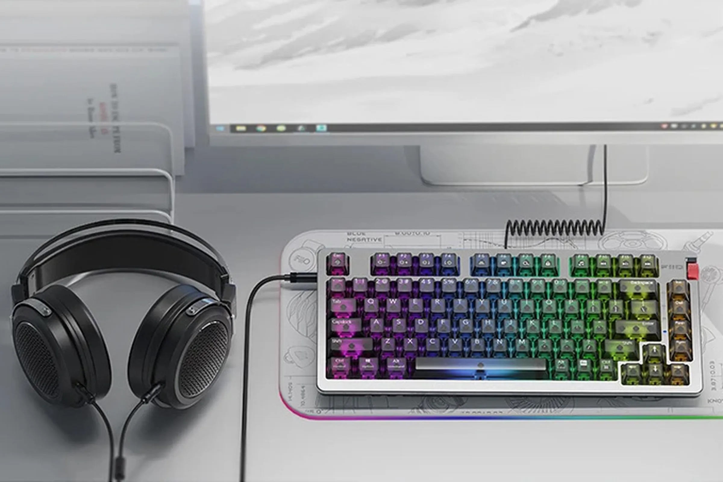 Корпус клавиатуры выполнен из алюминиево-магниевого сплава, который используется и в креплении гаскет-маунт. Последнее представляет собой систему прокладок, которая изолирует плату и плейт от корпуса с помощью различных мягких демпфирующих материалов, устраняя шумы, резонанс и реверберации. Справа на корпусе есть колёсико для регулировки громкости, также в него встроена пара портов USB. Девайс укомплектуют клавишами Gateron G Pro 3.0 с набором полупрозрачных колпачков, а переключатели можно заменить в горячем режиме без отключения клавиатуры. Устройство в форм-факторе 75% будет доступно к покупке в двух вариантах – проводном и беспроводном. Версии отличаются массой: проводная версия весит 1115 г, а беспроводная с аккумулятором на 4000 мАч – 1060 г. Производитель отмечает, что беспроводная модель не оснащается аудиокомпонентами и работает только как обычная клавиатура. Согласно техническим характеристикам, девайс полностью совместим с операционными системами Windows и macOS.