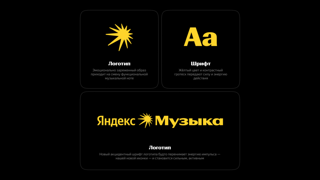Основное направление развития сервиса отразилось и в визуальной айдентике Яндекс Музыки. Новый логотип отказался от общепринятых музыкальных ассоциаций (музыкальной ноты) и стал ярким импульсом, символизирующим момент воодушевления пользователя от чутко подобранной для него музыки.