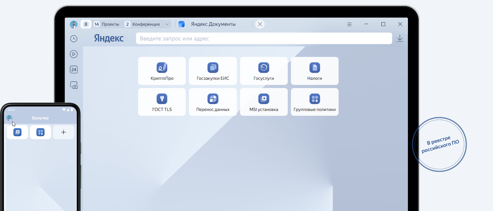 Яндекс Браузер для организаций — безопасное решение с выделенной техподдержкой и удобными инструментами администрирования для компаний любого масштаба. Он входит в реестр российского ПО, работает на Windows, macOS и совместим с российскими ОС на базе Linux. Корпоративный Браузер полноценно работает в закрытых сетевых контурах, предлагает множество групповых политик для гибкой настройки и поддерживает электронные подписи КриптоПро, сертификаты НУЦ и шифрование TLS по ГОСТ.